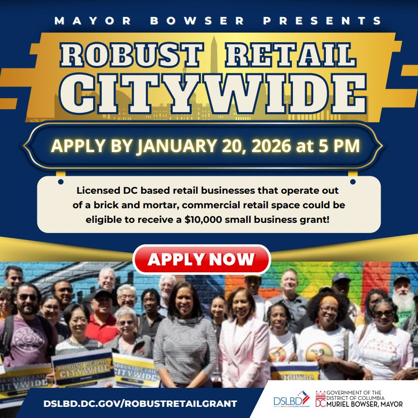 The District’s Department of Small and Local Business Development (DSLBD) is now accepting applications for the FY 2026 Robust Retail Citywide Grant Program.