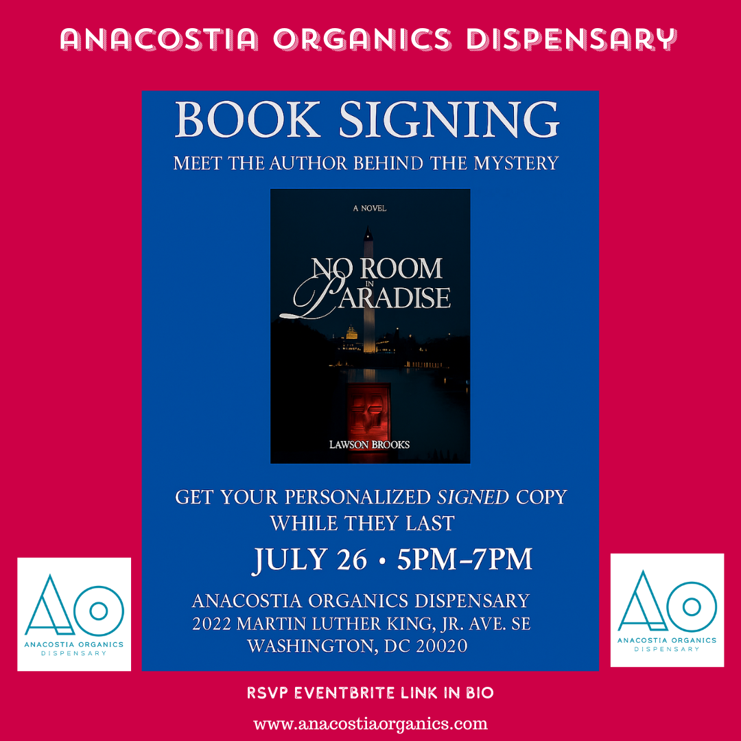 Join Anacostia Organics Dispensary on Saturday, July 26th from 5:00 to 7:00 PM for a free book signing and community gathering with acclaimed author Lawson Brooks—right in the heart of Historic Anacostia.